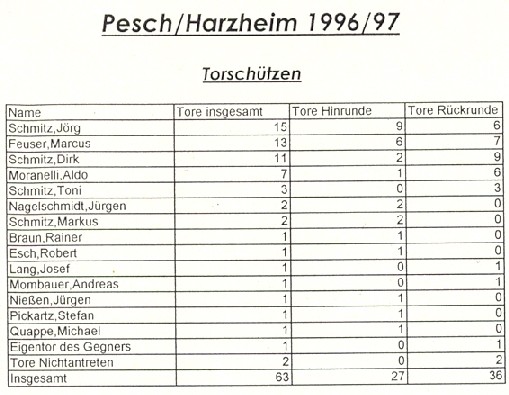 Endlich konnte ich bei meinem Heimatverein und vor den heimischen Fans vorspielen. Da war es auch nicht tragisch, dass die SpVg Pesch/Harzheim "nur" in der Kreisliga B kickte. In den letzten 5-10 Jahren hatte sich der Verein einen Namen als Fahrstuhlmannschaft zwischen der B- und C-Liga gemacht. Aufgrund des geringen Einzugsgebietes und der Konkurrenz aus den Nachbardörfern hatte man traditionell eine dünne Spielerdecke zur Verfügung. Dies änderte sich in dieser Saison. Zum einen heuerte ein neuer Trainer an, der aufgrund seiner Überredungskunst einige Spieler mitbrachte, und zum anderen kamen 4 A-Jugendliche (einschließlich mir) neu hinzu. Da bei den Neuzugängen aber kein einziger Stürmer dabei war und nur 2 nominelle Stürmer im alten Aufgebot standen, entschloß sich der Trainer mich aufgrund meiner torreichen A-Jugend Saison als Stürmer auflaufen zu lassen.
