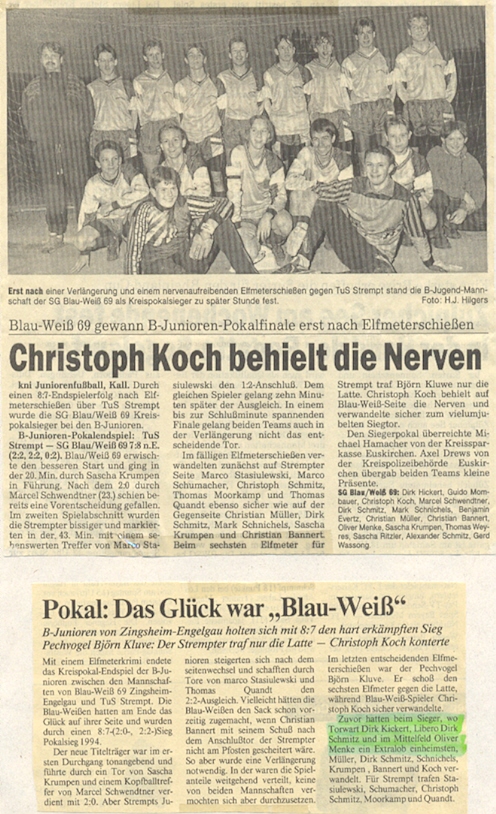 Meine wohl erfolgreichste Zeit in der Jugend erlebte ich als Libero in der B-Jugend des Vereins SG Blau-Weiß Zingsheim. Wiedereinmal ging ein Wechsel dem Ganzen voraus. Aufgrund mangelnder Spieleranzahl für die B-Jugend meldete der TSV Feytal keine Mannschaft zum Spielbetrieb an. Daraufhin schloss ich mich wieder meinem alten Club an, der nun wieder eine Jugendmannschaft stellen konnte. Hier traf ich mit vielen ehemaligen Kameraden, mit denen ich in der D-Jugend gespielt hatte, zusammen. Wir waren auf Anhieb eingespielt und marschierten in der Meisterschaft + im Pokal von Sieg zu Sieg. Nun wurden auch die lokalen Zeitungen auf uns aufmerksam und berichteten vermehrt über uns (was für Jugendspiele eigentlich untypisch war!) --> siehe Zeitungsartikel