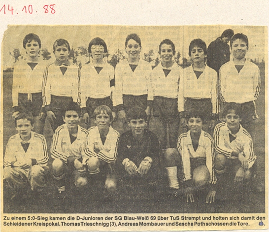 In der D-Jugend wechselte ich dann wieder zur SG Blau-Weiß. Hier kickte ich mit einer hochkarätig besetzten Truppe, die mir aufgrund meines Alters (ich war der Jüngste!) körperlich und technisch voraus waren. So blieb mir zunächst nur die Ersatzbank. Als man nach einer mehr oder weniger erfolgreichen Saison merkte, dass nicht nur das Alter und die Statur, sondern vor allem die Einsatzbereitschaft zählt, wurde die Mannschaft umgekrempelt und man setzte wieder auf mich (In der Zwischenzeit hatte ich im Training u. beim Freizeit-Kicken meine Technik extrem verbessert). Heraus sprangen einige Erfolge in dieser Saison. U.a. der Kreismeistertitel und der Pokal-Erfolg (siehe Bild)...