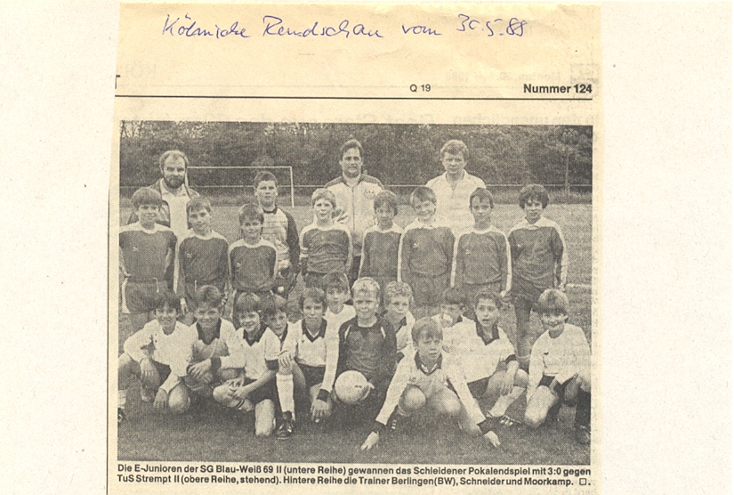Im ersten Jahr stand zuerst einmal ein Vereinswechsel auf dem Plan, da der SV Nöthen alleine keine E-Jugend zusammenstellen konnte. So verschlug es mich zum anderen Pescher Nachbarverein SG Blau-Weiß 69 Zingsheim. Dort spielten wir erstmalig strukturierten und organisierten Fussball. Dieser sollte sich dann auch frühzeitig auszahlen (siehe Bild) !